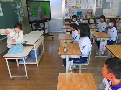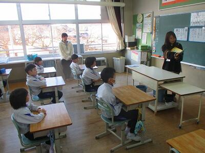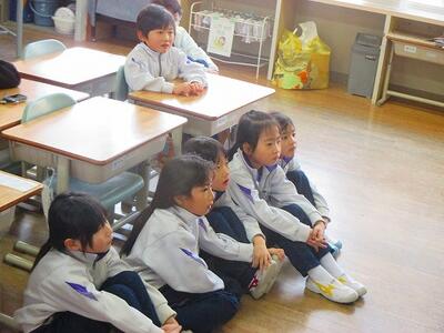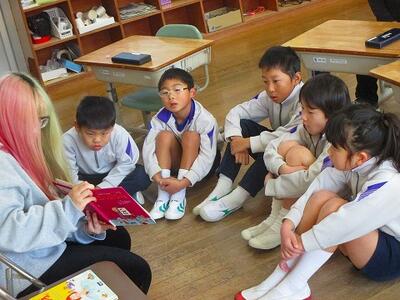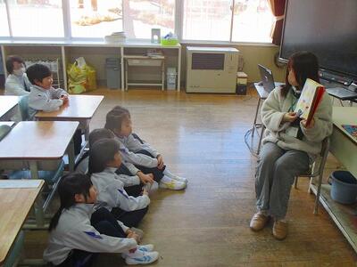 今年初めの読み聞かせ。早朝より5人の大学生が来校し、子どもたちに本の読み聞かせをしてくださいました。