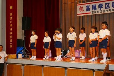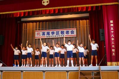 体育館で行われた「高尾学区敬老会」に、3・4年生が出し物を披露しました。