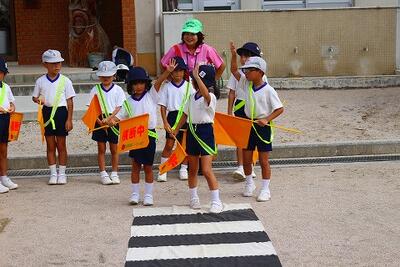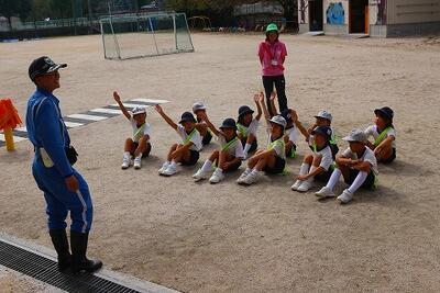まず、運動場で横断歩道のシートを使って練習をしました。横断旗の使い方も上手ですね。