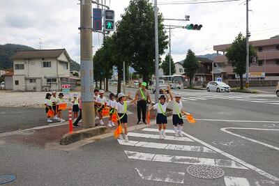 新見交通安全母の会の方と新見警察署のおまわりさんに、安全な渡り方を教えていただきました。