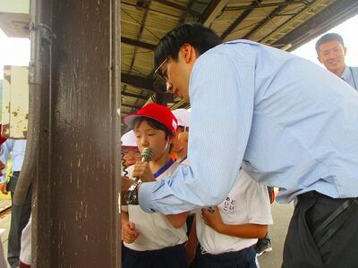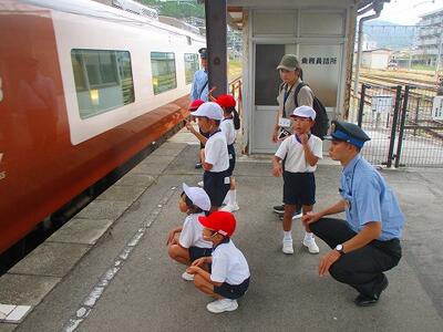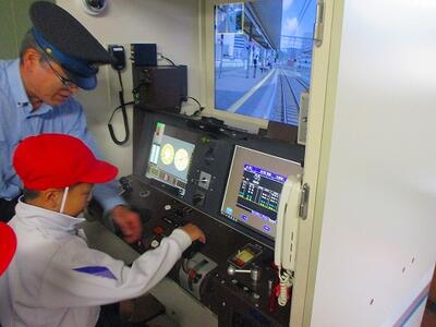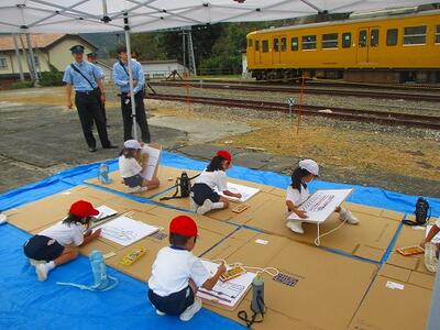 1・2年生が、新見駅で電車の絵を描いたり、切符の買い方を体験したりしました。