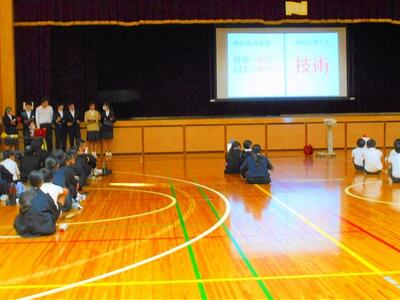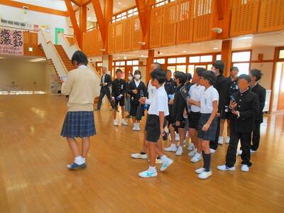 交流タイムでは、一中についての○☓クイズに参加した後、各小学校の代表者が先輩へ中学校生活について気になることを質問しました。中学校進学に向けての準備が始まっています。