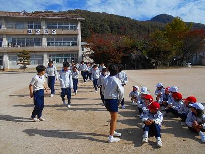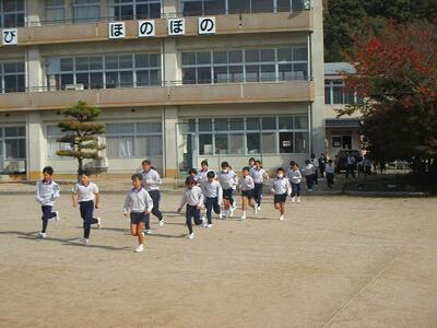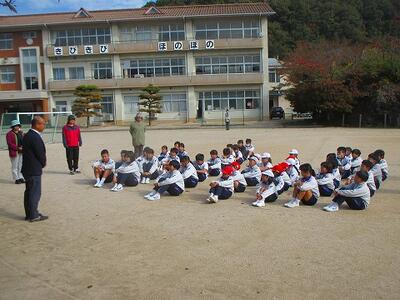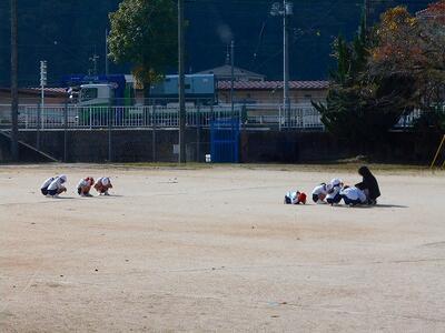 業間休みに行ったので、運動場で遊んでいる子もいました。運動場中央に集まり、低い姿勢をとることができました。