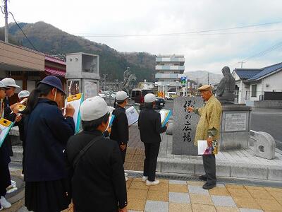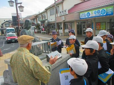 午後からは、新見庄について学習しました。まずは新見駅に行って、「たまがき銅像」を見学しました。定岡さんが説明をしてくださいました。