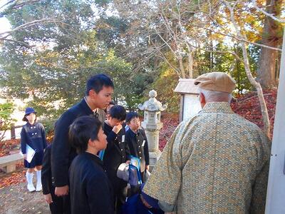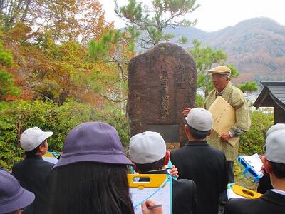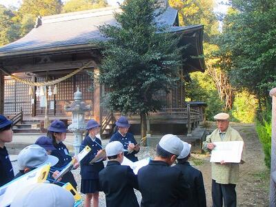 まず、高尾小学校内にある「早乙女岩」について、本校の先生が説明しました。