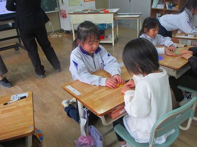 3時間目は図工です。折り紙で作品を作りました。「一緒にしよう」「できるかな?」