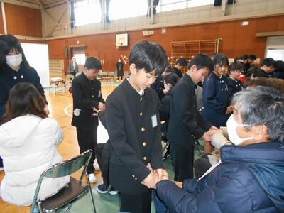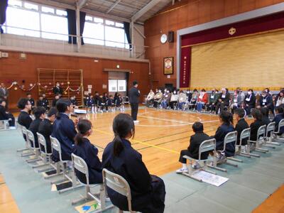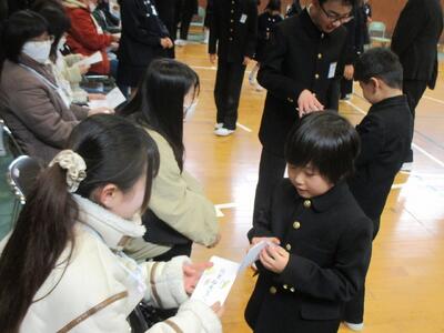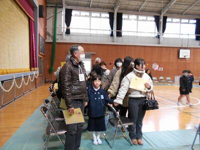 退場。1・2年生が手をつないで誘導しました。ボランティアや地域の皆様、ありがとうございました。来年度もよろしくお願いします。