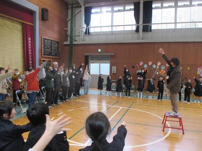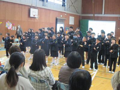 そして、各学級からの出し物。1・2年生は手遊びで交流しました。