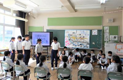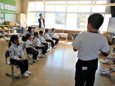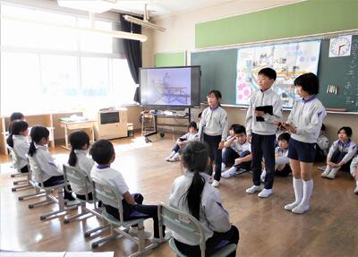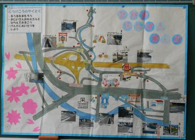 3・4年生は、総合的な学習の時間で通学路安全マップを作成しました。それを使いながら、安全な登下校について1年生に紹介しました。