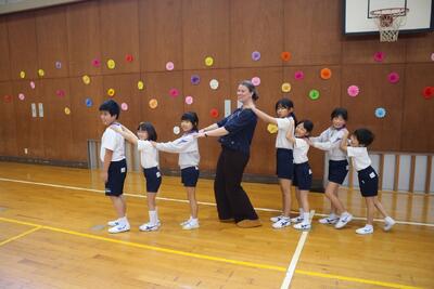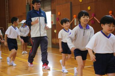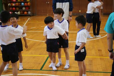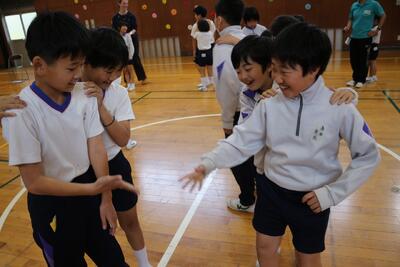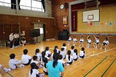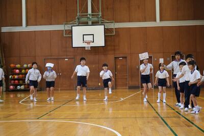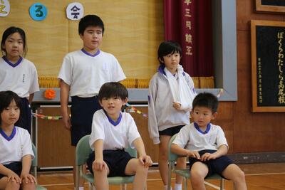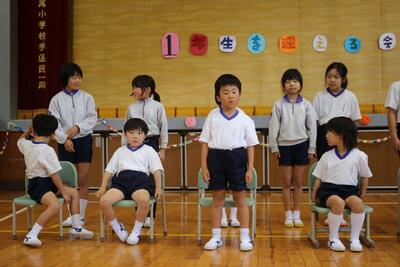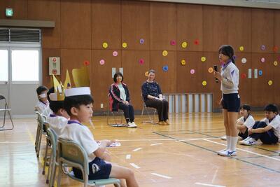 高尾小学校についての3択クイズ。1年生も挙手をしました。