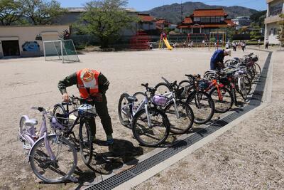 後半は、上下学年に分かれました。4~6年生は、正しい自転車の乗り方について学習しました。まずは自転車点検。