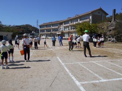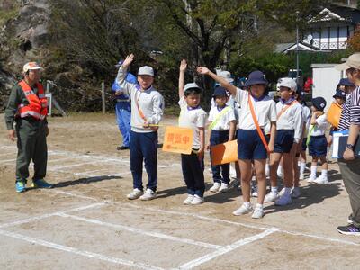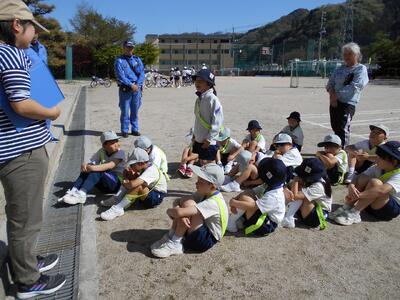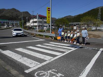前半は、通学班で横断歩道の正しい歩き方について練習しました。