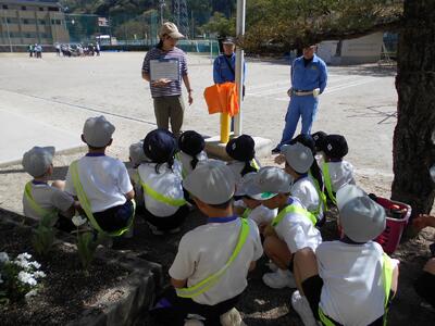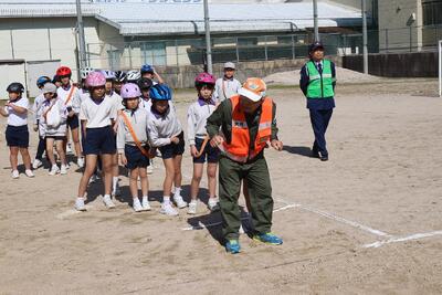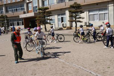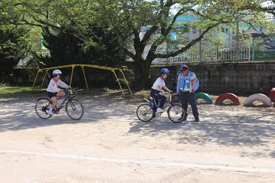 先日、交通安全教室を実施しました。新見警察署や岡山県安全安心教育講師団の方々に、安全な歩行の仕方や自転車の乗り方について教えていただきました。